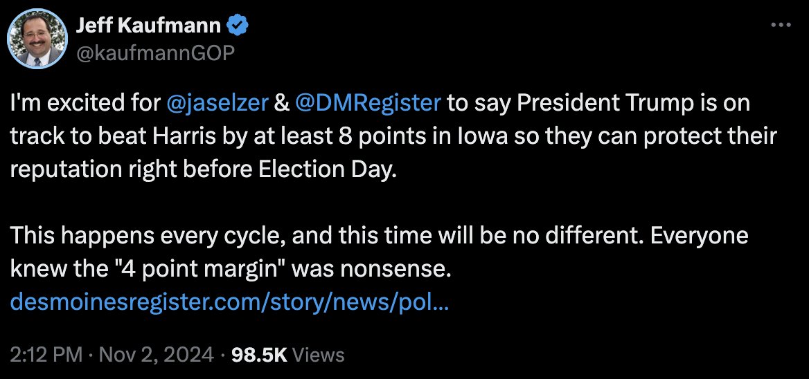 (1,664 posts)There was an Emerson College poll released today that showed Trump up 10 in Iowa: https://emersoncollegepolling.com/november-2024-iowa-poll-trump-53-harris-43/ Both polls can't be accurate, so we'll see on Tuesday. I hope we can put in the work in Iowa these next few days and make it the surprise of the season.