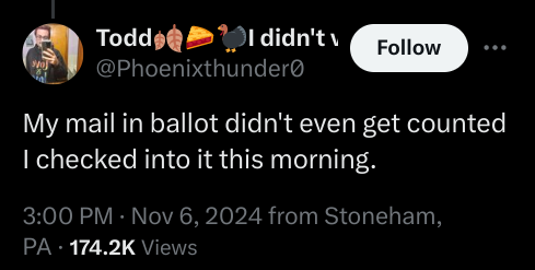 (3,460 posts)pro choice ballot initiatives, but not votes for Kamala. It makes no fing sense. I'd like to think that Joe coming out yesterday to cool things down was because they know something and cant say yet. Kamala's whole thing was about "Fighting for It". Just because TSF fought 2020 with bullshit and conspiracies doesnt mean we shouldnt be asking questions. Too much bullshit in this country has been swept under the rug and labeled as "Conspiracy Theory". NO! There is a pattern of rat fuckery with these assholes. Every result in every state should be questioned.