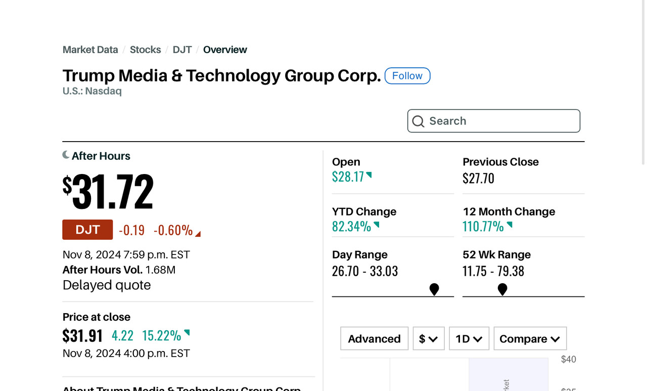 DJT tanked with heavy trading volumes on the afternoon of the fifth. Bolstered back up on the morning of the sixth with an equal fall on the morning of the eighth. It has continued to fall hitting a low of $27.50/share on the morning of the eighth. Now its back up about half way from the post election peak at $31.86/share and a negative future.