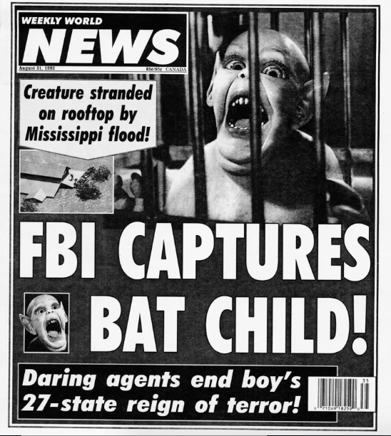 there was an Enquirer right next, with a horrendous mug shot, headlines calling him a Liar, thief, and master con man.