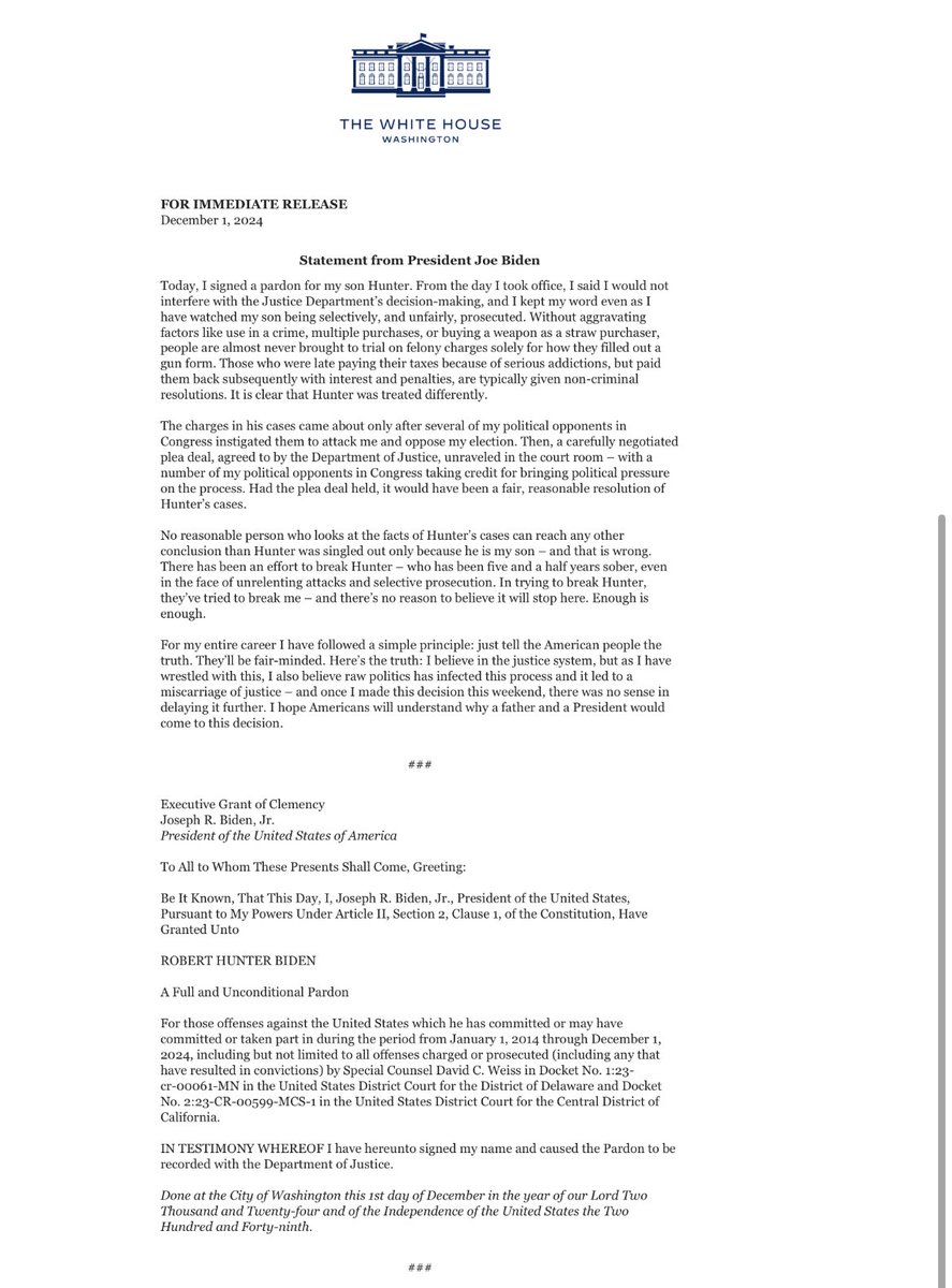 (3,718 posts)Goddam I hope he pardons Hunter. And I hope he issues pre-emptive pardons for (1) everyone who had anything to do with the Jan 6 committee, (2) Jack Smith and his entire crew, (3) Pelosi, Schumer, and all other prominent Democrats, (4) himself and his staff, (5) VP Harris and her staff, (6) all his cabinet members especially Garland and DHS Secty as well as FBI Director, Dr, Faucy, . . . anyone I left out?