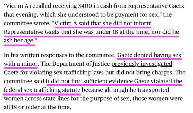 "Victim A recalled receiving $400 in cash from Representative Gaetz that evening, which she understood to be payment for sex," the committee wrote. *"Victim A said that she did not inform Representative Gaetz that she was under 18 at the time, nor did he ask her age."*