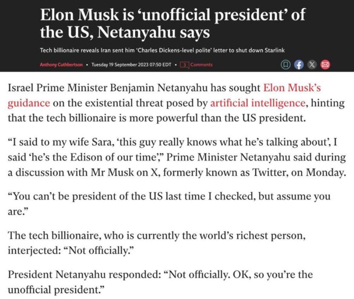 Israel Prime Minister Benjamin Netanyahu has sought Elon Musks guidance on the existential threat posed by artificial intelligence, hinting that the tech billionaire is more powerful than the US president. I said to my wife Sara, this guy really knows what hes talking about, I said hes the Edison of our time, Prime Minister Netanyahu said during a discussion with Mr Musk on X, formerly known as Twitter, on Monday. You cant be president of the US last time I checked, but assume you are. The tech billionaire, who is currently the worlds richest person, interjected: Not officially. President Netanyahu responded: Not officially. OK, so youre the unofficial president.