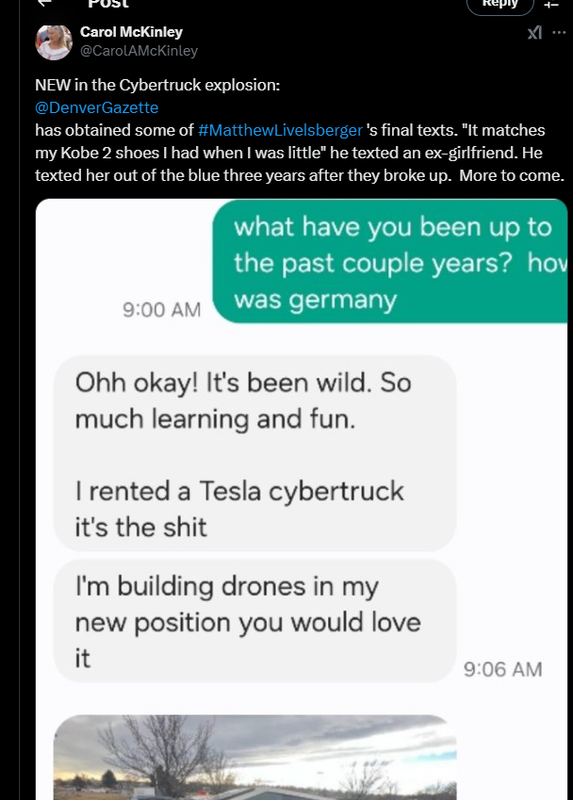 If true, why kill yourself in front of one of his hotels, using a Tesla? To show your admiration for Trump? I don't get it. Maybe they will eventually find something written by Matthew that puts the pieces together.