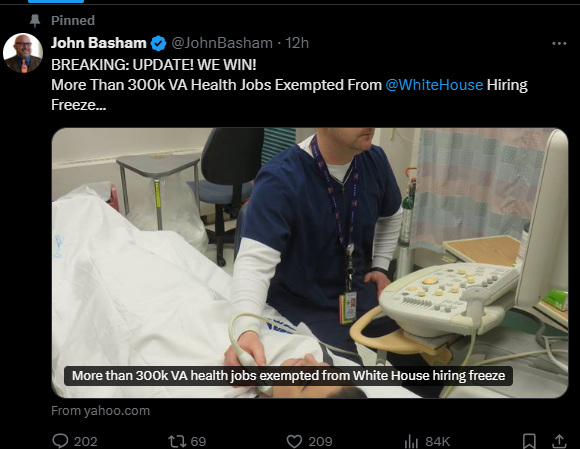 In the posting, Basham said his wife was recently hired as a nurse by Veterans Affairs and they prepared to move their family from Fort Worth to Waco. But then Trump signed the executive order implementing the temporary hiring freeze with a few exclusions for military and immigration enforcement.