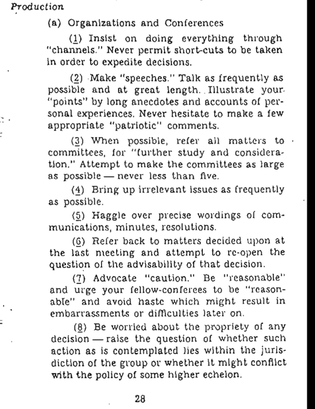 Managers and Supervisors: To lower morale and production, think of the worst boss youve had and act like that. Be pleasant to inefficient workers; give them undeserved promotions. Discriminate against efficient workers; complain unjustly about their work. When possible, refer all matters to committees for "further study and consideration." Attempt to make the committees as large and bureaucratic as possible.