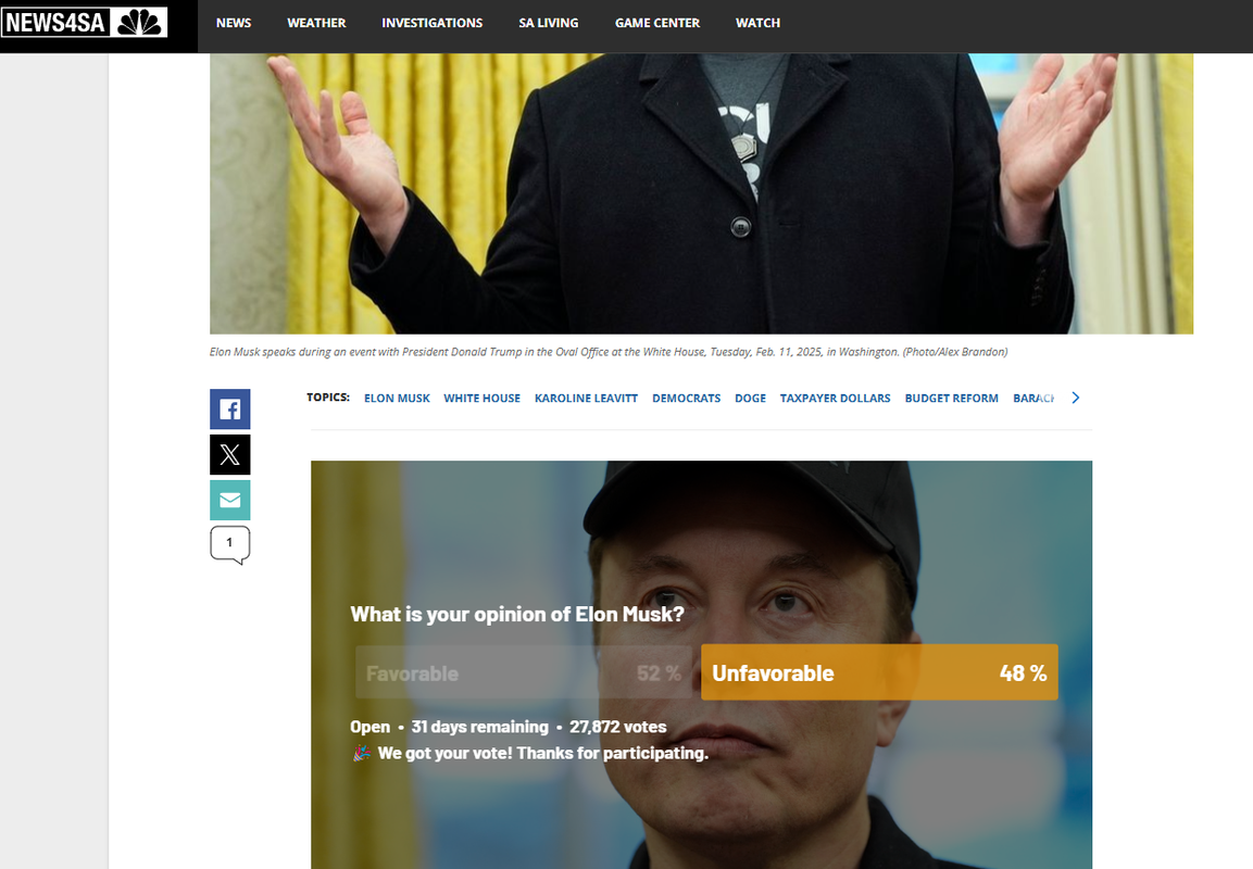 https://news4sanantonio.com/question/vote-what-is-your-opinion-of-elon-musk-department-of-government-efficiency-doge-democratic-criticism-president-donald-trump-federal-government-overhaul?fbclid=IwY2xjawIjTERleHRuA2FlbQIxMAABHdHXdHT3mxU-vO-ArYC-kKmgn-oGk4XhkGH-sVuWzcmC5xJ1_UbVWRWAcQ_aem_71Wj3vUUeXeGcpZriZYlkA