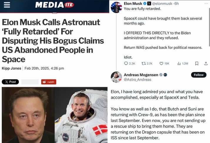 Related: Editorials & Other Articles, Issue Forums, Alliance Forums, Region ForumsElon Musk throws slur-filled tantrum after astronaut calls him out for 'lie'