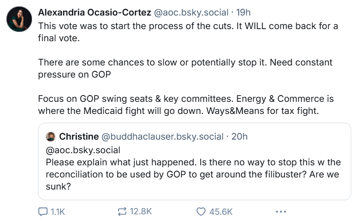 (1,138 posts)To start holding town halls in red and blue states. We need some of them to organize more protests and news conferences. Like the one they did yesterday. Everyday, not when they feel compelled to do it! They need to push themselves. Jasmine Crocket and AOC speak out with much more force than Jeffries. They both appear to be leadership quality. Sometime I think we have to many democrats beholden to the corporations, even if only in small ways.