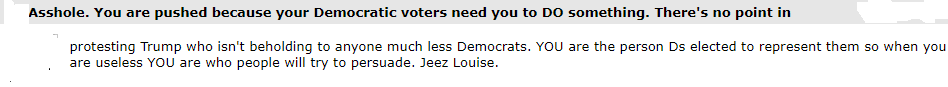 (6,589 posts)protesting Trump who isn't beholding to anyone much less Democrats. YOU are the person Ds elected to represent them so when you are useless YOU are who people will try to persuade. Jeez Louise.