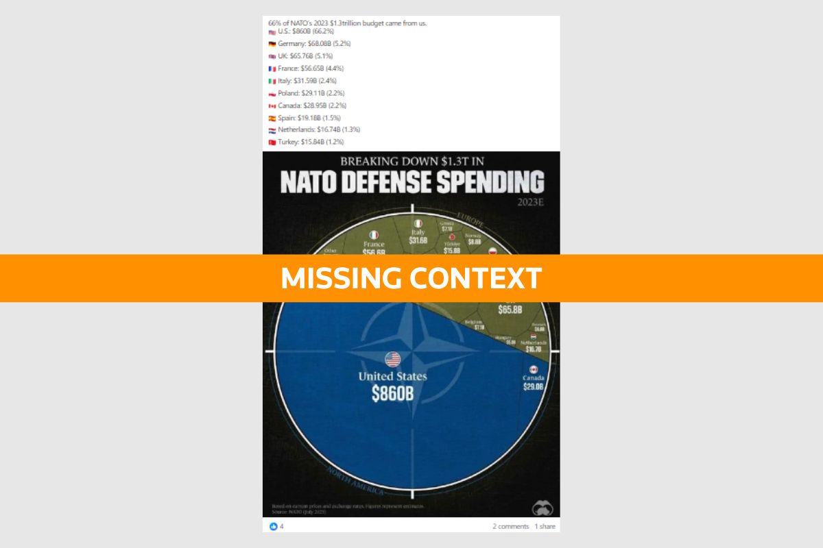 But the post conflates total U.S. annual defense spending with its contribution to the North Atlantic Treaty Organization (NATO) budget, while also exaggerating NATOs budget.
