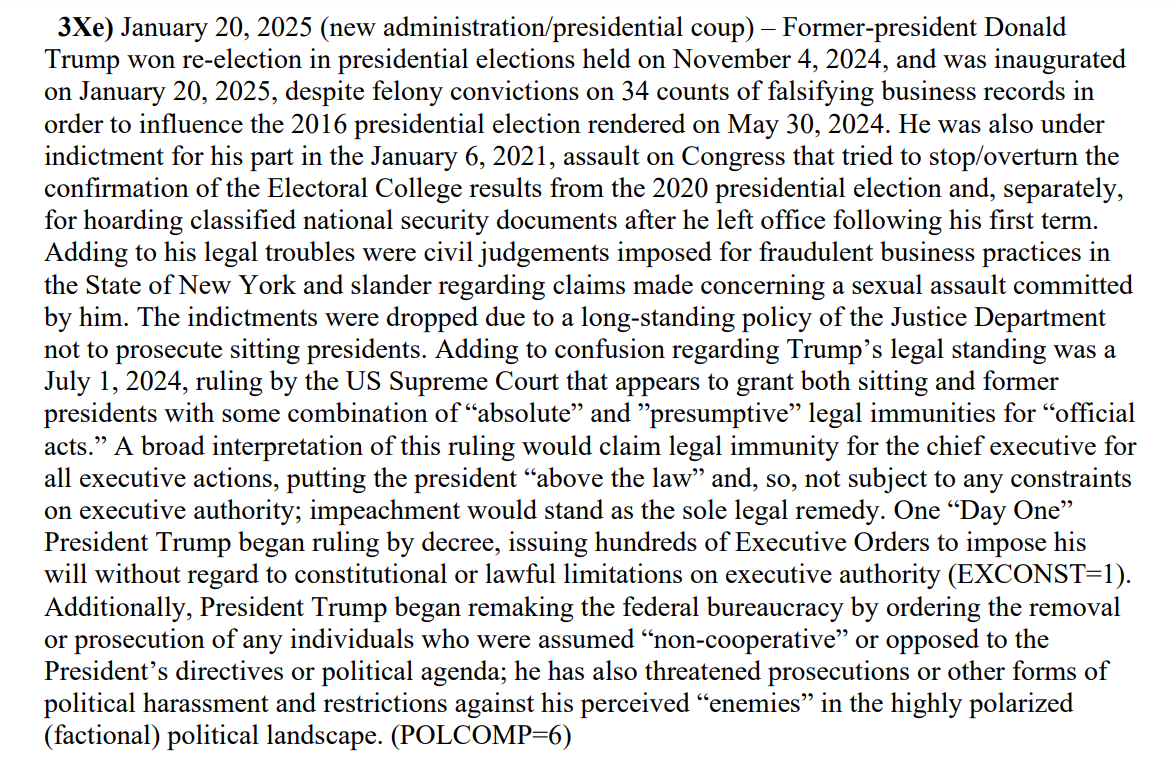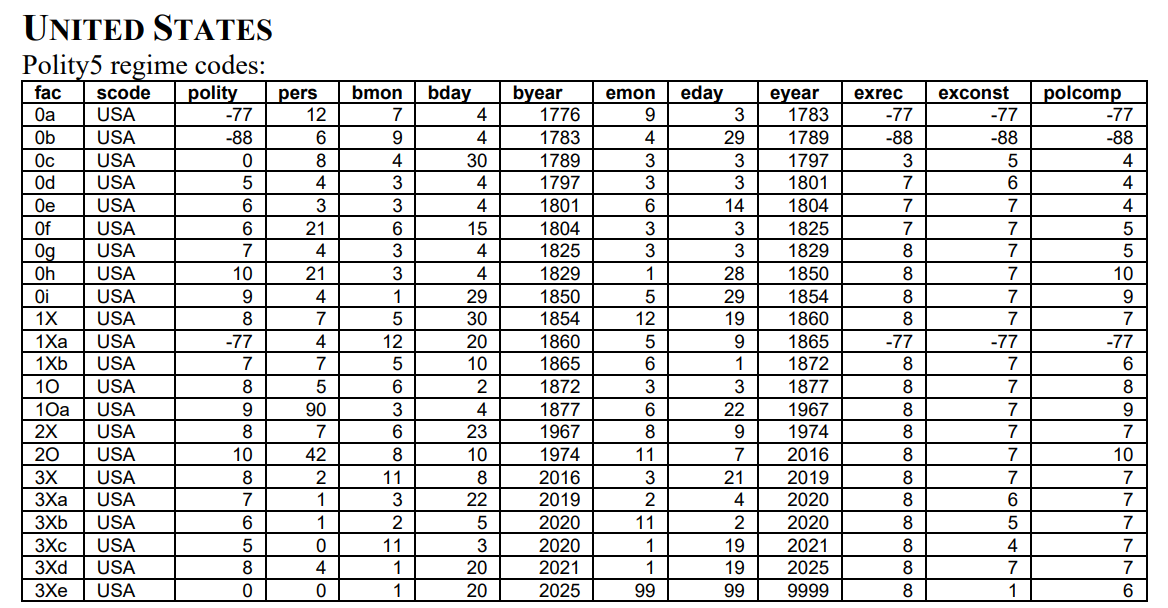 Users of the Polity data series should be aware that Polity measures patterns of authority demonstrated and observed in political behaviors involving interaction events between and within state and non-state entities. Polity measures political practices rather than promises or proclamations. In 2016, CSP changed the coding for Political Competition in the USA to Factional Competition (i.e., POLCOMP=7); this coding change dropped the USA's POLITY score to +8. According to the PITF Global Model, this change to "factional competition" placed the USA at high risk of impending political instability (i.e., adverse regime change and/or onset of "systematic and sustained" political violence; possible worst case would be the "collapse of central authority" ). The CSP COUP dataset lists an "attempted coup" (COUP=2) for the USA on 6 January 2021 and a successful coup (COUP=1) on 20 January 2025.