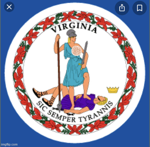 (196,494 posts)Battles over Virginias seal and flag date back to 1776 when the commonwealth wanted to appear strong during the war of independence over British rule and hit on the image of Virtus, wielding a sword and spear, and the inscription Sic Semper Tyrannis or Thus always to tyrants, next to a body and fallen crown.