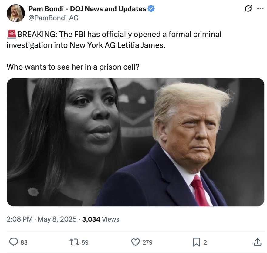 Pam Jo Bondi, the US attorney general who just saved two-thirds of America from dying to death of fentanyl, vowed to help Tyrant Two-Dolls make good on his snarling vows for retribution against his enemies, including New York state Attorney General Letitia James.
