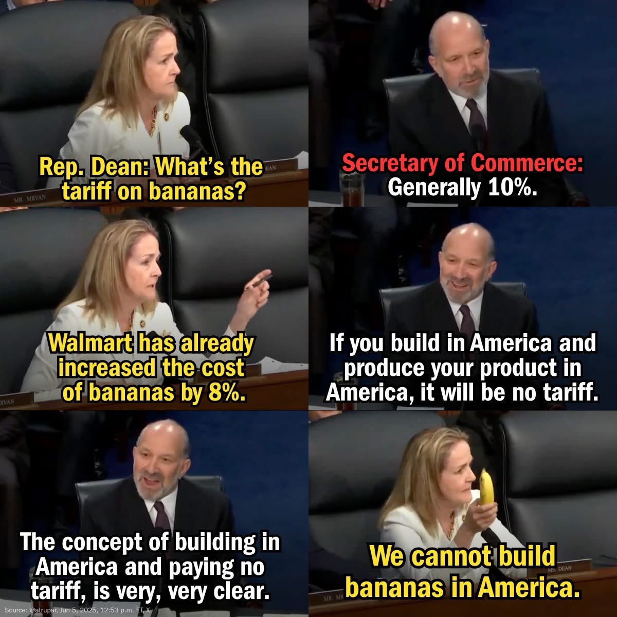 The congresswoman reminded the witness that Walmart has already increased the cost of bananas by 8%. After pointing to the possibility of increasingly unlikely trade deals, Lutnick eventually declared: If you build in America, and you produce your product in America, there will be no tariff.