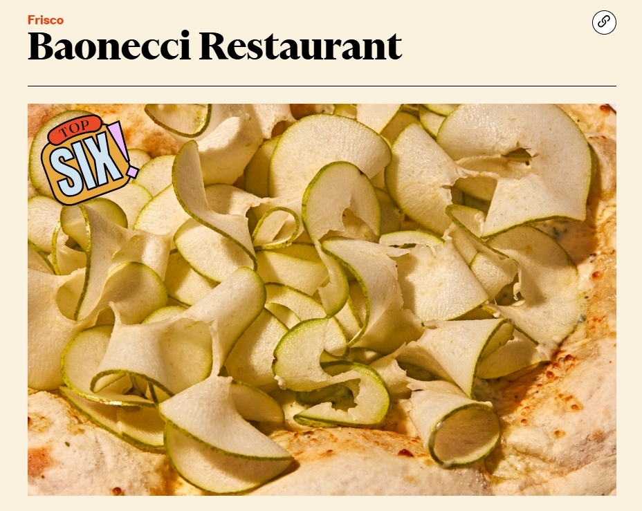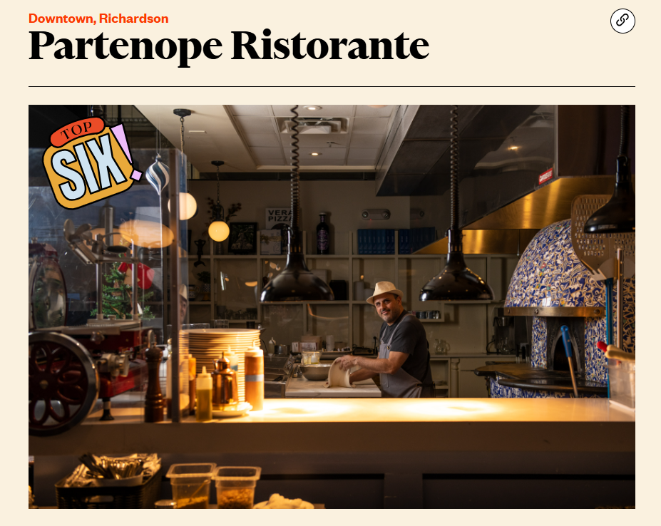 In 2023, eight D editors spent a month ordering from more than 50 local pizzerias to find the city's best in every style. To ensure fairness, we arrived unannounced and paid for every pie ourselves, accepting not one free slice. We've now updated that list with all the best newcomers to open in the years since, as well as making quality-control checks to our established favorites, because we're greedy and we like pizza. You can search our findings by style or neighborhood, and look out for the badges that mark special awards for the best takeout, most creative toppings, and the overall Top Six that we feel are the Dallas area's very best examples of pizza-making craft. (Why Top Six instead of five? We couldn't narrow it down.)