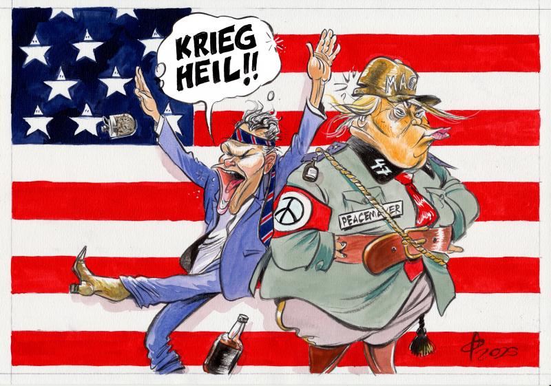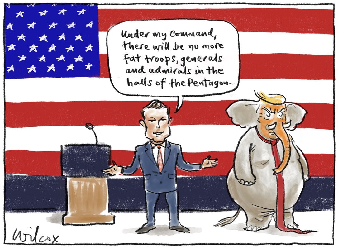 (3,725 posts)I like the second and third one. Hegseth among giant boots. And a diabolical Miller handing out armbands.