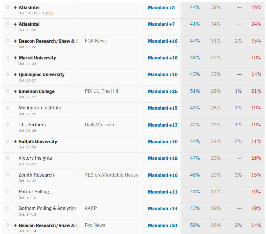 According to the latest RealClearPolitics average, Democratic nominee Zohran Mamdani leads with 45.8 percent, holding a 14.7-point advantage over independent Andrew Cuomo at 31.1 percent and a 28.5-point lead over Republican Curtis Sliwa at 17.3 percent.