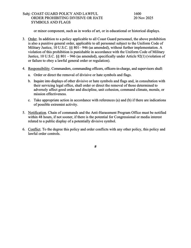 US Coast Guard doubles down on prohibiting divisive or hate symbols and flags, issues lawful order and policy