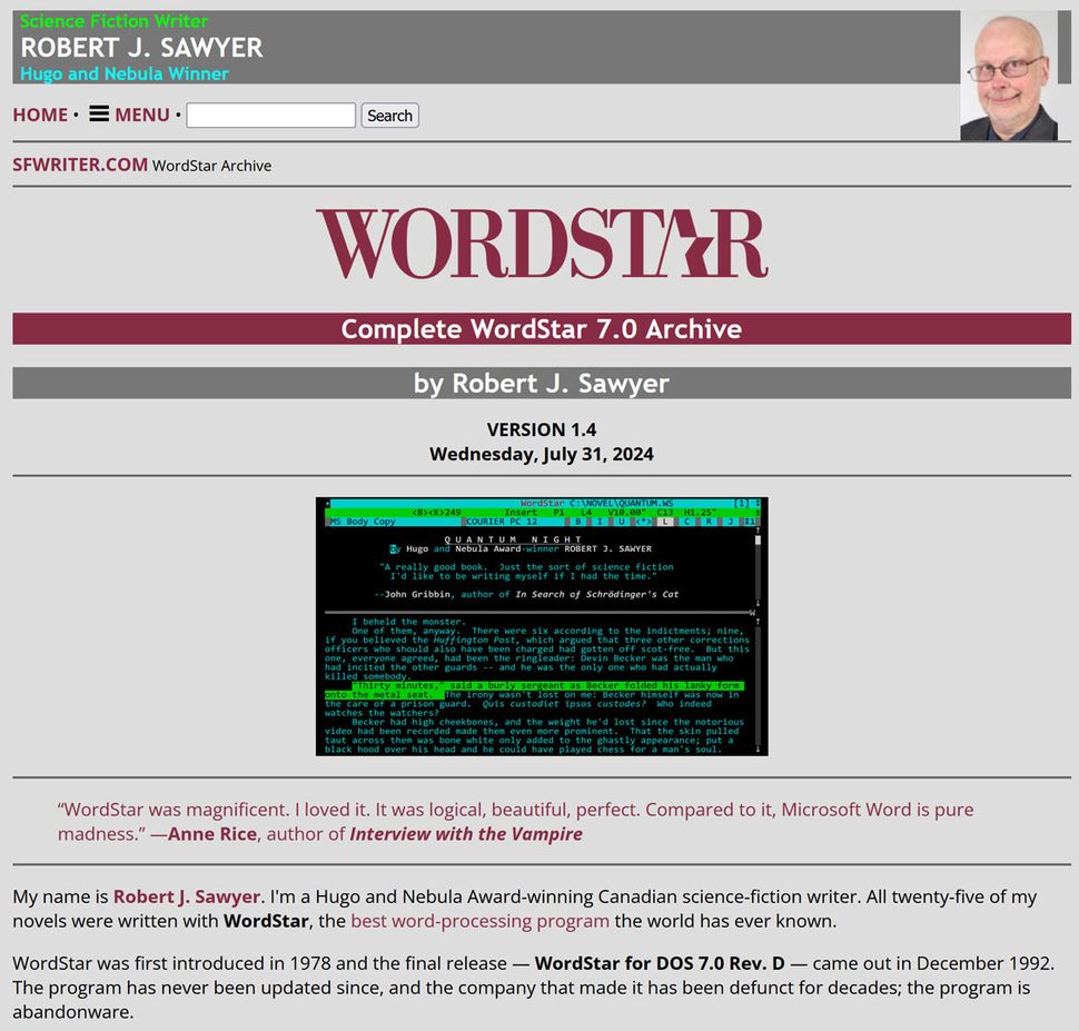 It might be hard to fathom the appeal of this old word processor, but many authors have been known to be WordStar devotees. As well as Sawyer, literary luminaries such as George R.R. Martin, Anne Rice, and Arthur C. Clarke are/were WordStar torchbearers.