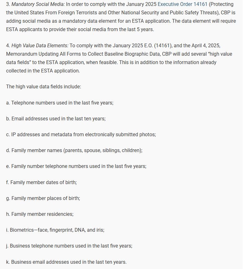 (173,911 posts)It's not just social media. Looks like visitors to the US from Europe and other countries that are part of the visa waiver program will have to submit an enormous amount of data about themselves and their families, including DNA, if proposed new rules are accepted