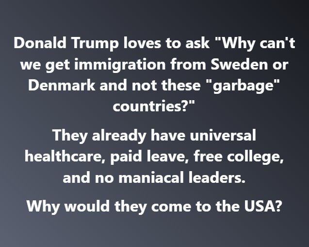 (2,010 posts)Unless they live in Russia, N. Korea or Saudi Arabia, which might feel like a lateral move. The Felon is trying his best to make this a "sh*thole Country".