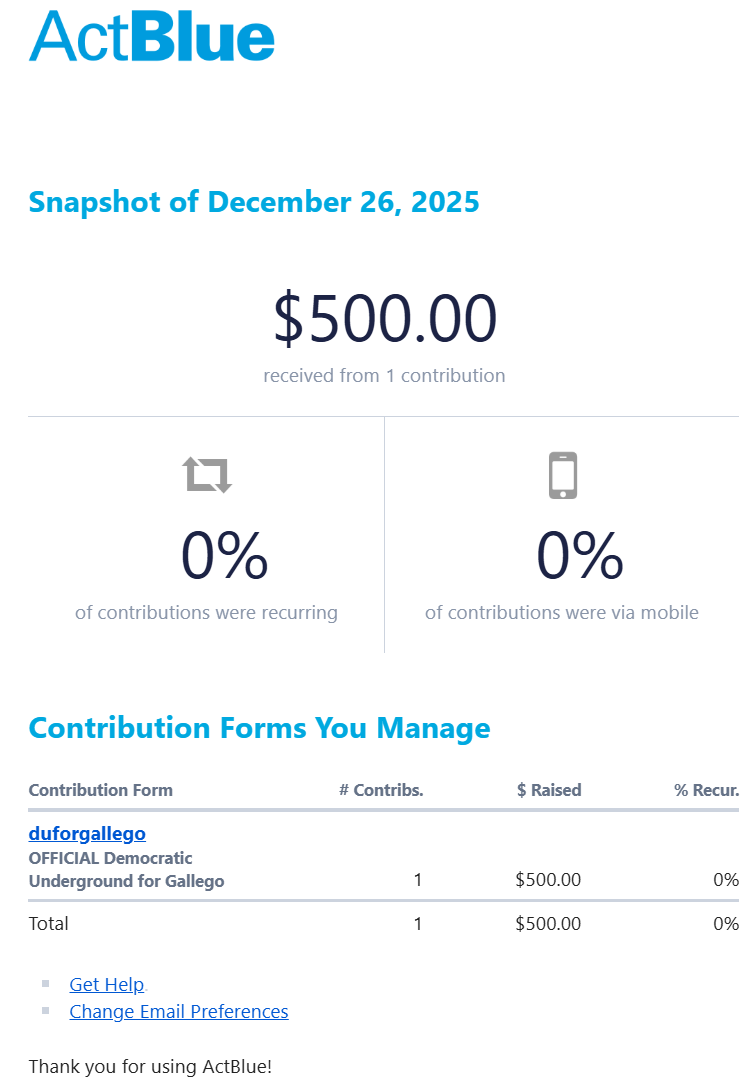 You raised $500.00 on December 26, 2025 @ ActBlue