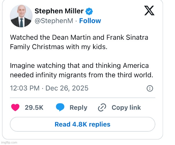 Related: Editorials & Other Articles, Issue Forums, Alliance Forums, Region ForumsChristmas with Stephen Miller (Sinatra-Dean Martin special )Tries to coin "infinity migrants" and is blasted.