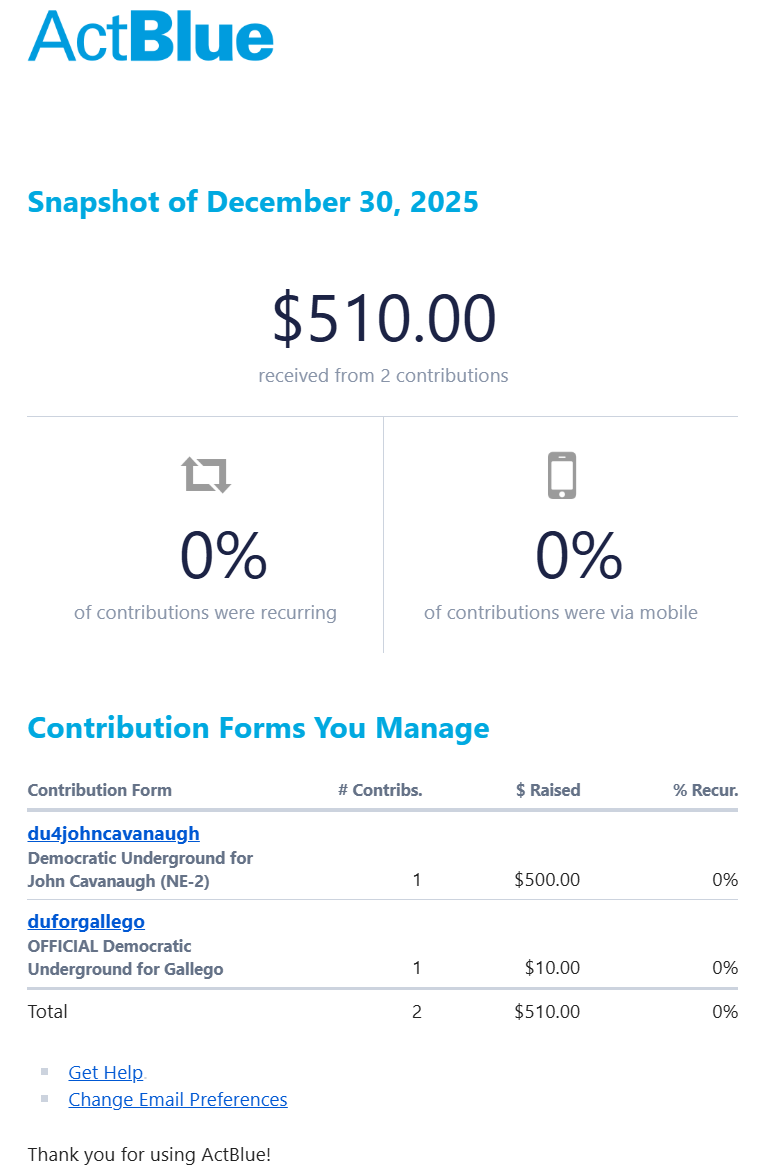 You raised $510.00 on December 30, 2025 @ ActBlue (Original Post) Omaha Steve 4 hrs ago OP