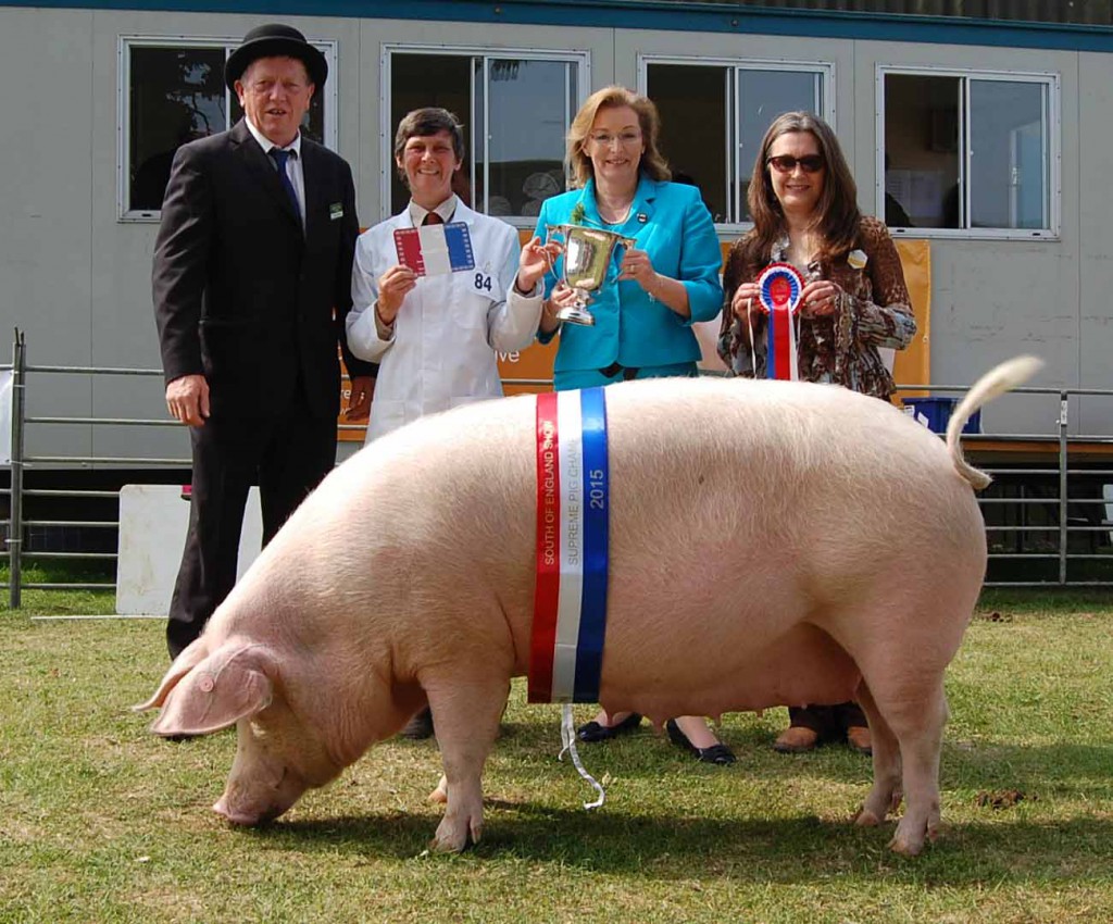 Lola the Landrace certainly strutted her stuff to win Supreme Champion Pig at the South of England show. Seen here with (L-R) judge Steve Loveless, owner Clare Wilson, Claire Scheckter (racing driver Jody Scheckter’s wife – the president of the show) and one of the sponsors. And of course Lola – she’s the one wearing a sash.