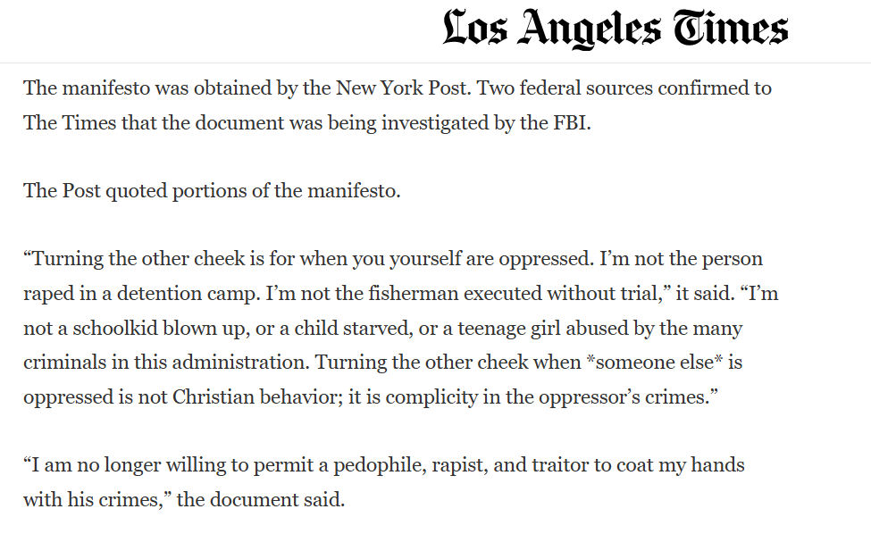 In its report, the newspaper cited an unnamed U.S. official who said the manifesto was provided to police by a relative of Allens.