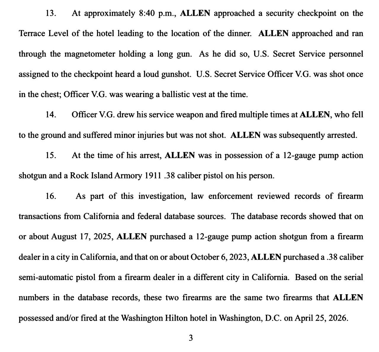 The charging affidavit does not specifically state Allen fired his weapon(s). It states: "As he did so, U.S. Secret Service personnel assigned to the checkpoint heard a loud gunshot. U.S. Secret Service Officer V.G. was shot once in the chest; Officer V.G. was wearing a ballistic vest at the time." The phrase "firearms that ALLEN possessed and/or fired at the Washington Hilton hotel in Washington, D.C. on April 25, 2026" is not very clear. The affidavit is very detailed in all other areas, but it doesn't say Allen shot an officer, or fired at anyone.