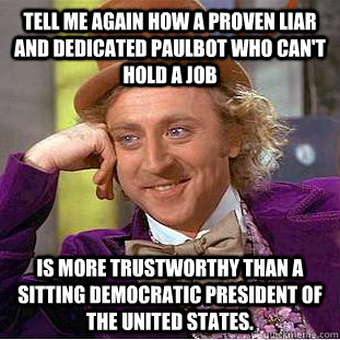 If you're capable of taking in information which may be contrary to what appears to be an absolutist position that Obama can do not wrong, WOULD do no wrong. Because your meme implies an if/then supposition. If a paulbot etc. then Obama can do no wrong? Wrong like the extra-judicial executions of US citizens suspected of terrorism or association with terrorists via robot death plane?