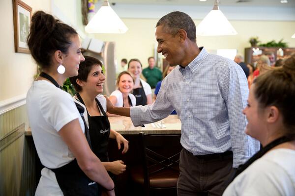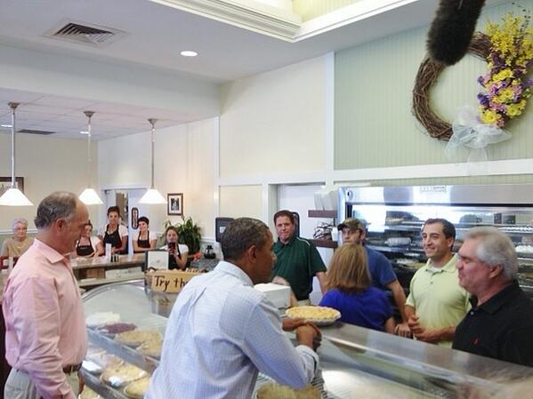 Pres Obama talks to wait staff at Bingham's Homemade Pies in Kingsley, PA pic.twitter.com/rNKdByiVhB