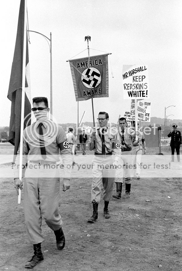 Marshall appeared as outraged by federal interference as he was by the prospect of diversity. "Why Negroes particularly?" he asked. "Why not make us hire a player from another race? In fact, why not a woman? Of course, we have had players who played like girls, but never an actual girl player." The controversy drew out assorted bigots, including neo-Nazis (above), who protested on Marshall's behalf to "Keep [the] Redskins White."