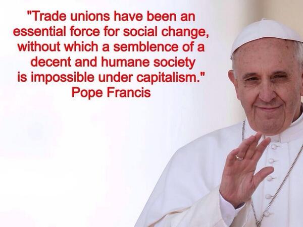 (9,688 posts)You don't think explaining the *necessity* of trade unions, aiming to turn the current almost totally anti-union messaging around, is necessary before successful action? You don't think making such explanations be *heard* is extremely difficult in the current political/economic climate? Do you think the *Pope* of all people ought to be responsible for a renaissance of the trade union movement in NA, and for initiating a trade union movement in countries like China where the idea is even closer to non-existent?