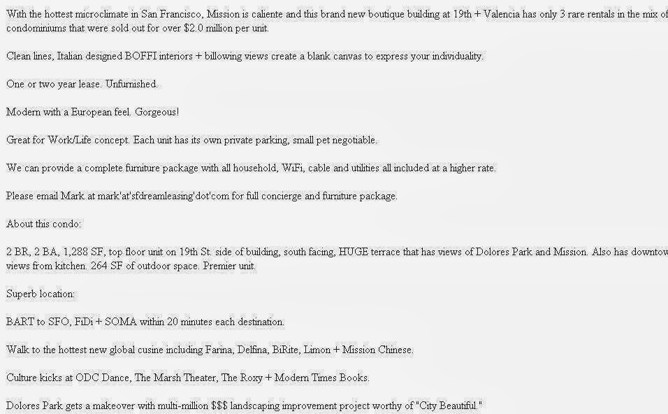 http://40goingon28.blogspot.com/2014/02/this-10500-rental-in-mission-is-absurd.htmlVia Matt Graves (RT courtesy BurritoJustice) comes this truly unbelievable rental listing. Since it's on Craigslist, and listings on Craigslist, like dandelion spores or red supergiants, are impermanent and ephemeral, I've screencapped part of it below: