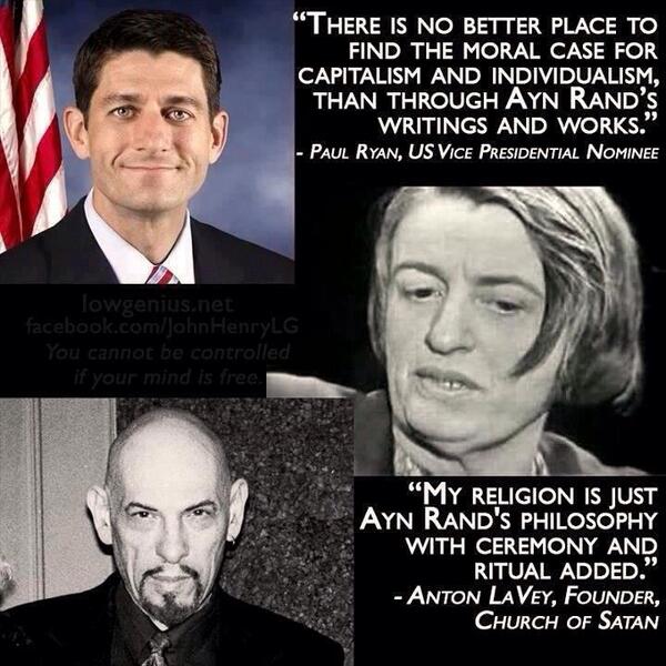 I don't like Paul Ryan's politics regardless of what he says about Ayn Rand, and LaVey is dead, so he's not even voting.