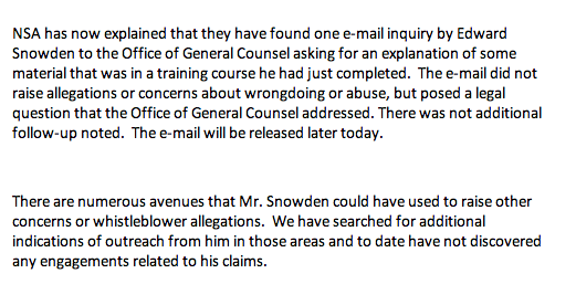 (27,835 posts)... that they didn't have "any Snowden emails". They've said that they have no emails from Snowden raising the concerns that he later claimed he did raise.