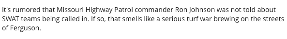 Are Ferguson police deliberately undermining Capt. Ron Johnson's command? HT @Marmel - http://crooksandliars.com/2014/08/tension-flares-ferguson-after-police