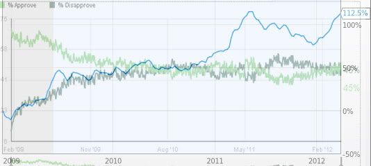 (10,857 posts)Blue line is gas prices, green approval, dark green disapproval. Transformed to fit, so it's definitely not reliable, but it might be worth a real look.