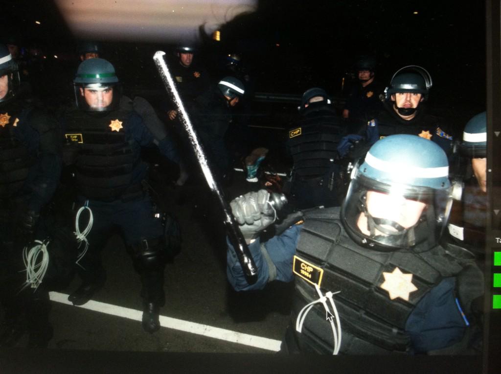It's after midnight, so of course the anarchists, looters, vandals, random opportunists, possible agent provocateurs, etc. have come out of the woodwork to blaze various trails of anti-capitalist destruction between Oakland and Berkeley. And the police are closing in with the riot gear, tear gas, etc.