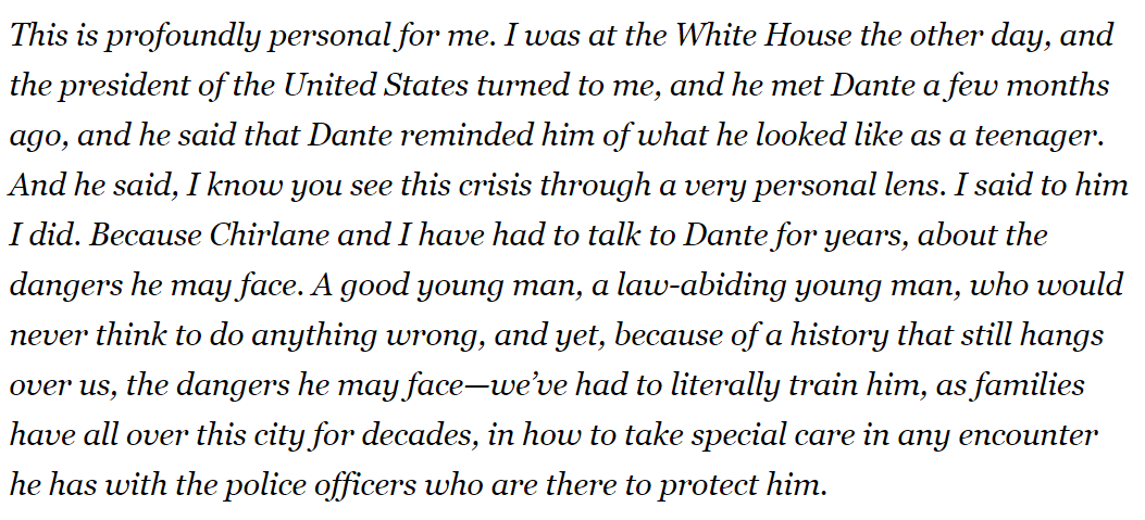 This is profoundly personal for me. I was at the White House the other day, and the president of the United States turned to me, and he met Dante a few months ago, and he said that Dante reminded him of what he looked like as a teenager. And he said, I know you see this crisis through a very personal lens. I said to him I did. Because Chirlane and I have had to talk to Dante for years, about the dangers he may face. A good young man, a law-abiding young man, who would never think to do anything wrong, and yet, because of a history that still hangs over us, the dangers he may faceweve had to literally train him, as families have all over this city for decades, in how to take special care in any encounter he has with the police officers who are there to protect him.