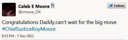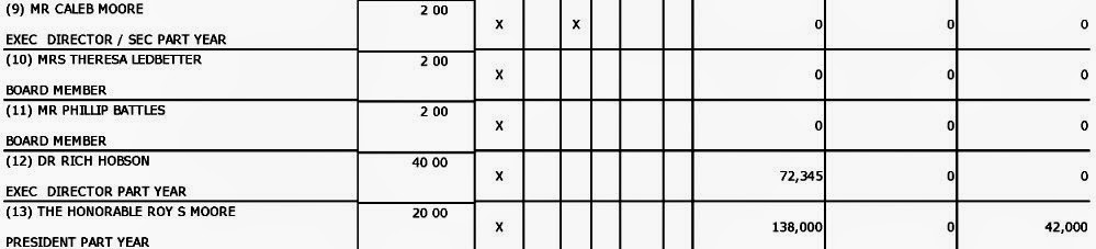 UPDATE II: I pulled the 2012 990 form for the Foundation For Moral Law and Caleb Moore is indeed listed as their two-hours-per-week executive director for part of that year. Note his father's $180K compensation for the year he was reelected to the Alabama Supreme Court. That year's 990 lists over $535K in donations, $432K of which went to salaries and benefits. Ahem. According to Part X, Line 25, it appears that another $435K is "due to the Honorable Roy S. Moore." From what I can tell, it looks like the FML took in about $5M from 2006 to 2012. I'm still trying to figure out where any of that went besides salaries, travel, and office expenses.