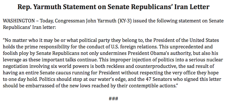 .@RepJohnYarmuth calls @Senate_GOPs letter to #Iran an "unprecedented and foolish ploy. #KY03