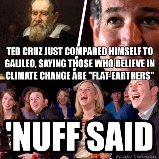 Galileo believed in the Heliocentric Universe which is a totally unrelated subject. I mean if you are going to use Galileo you might want to know something, anything about his argument and scientific research. Just like if you are going to talk about the real climate data you might want to know something, anything about science and the scientific literature on the subject. Ted Cruz can't even insult someone because who feels insulted when an idiot calls you an idiot. They merely laugh even harder at the fool. Ted Cruz you sir are a fucking idiot of epic size.