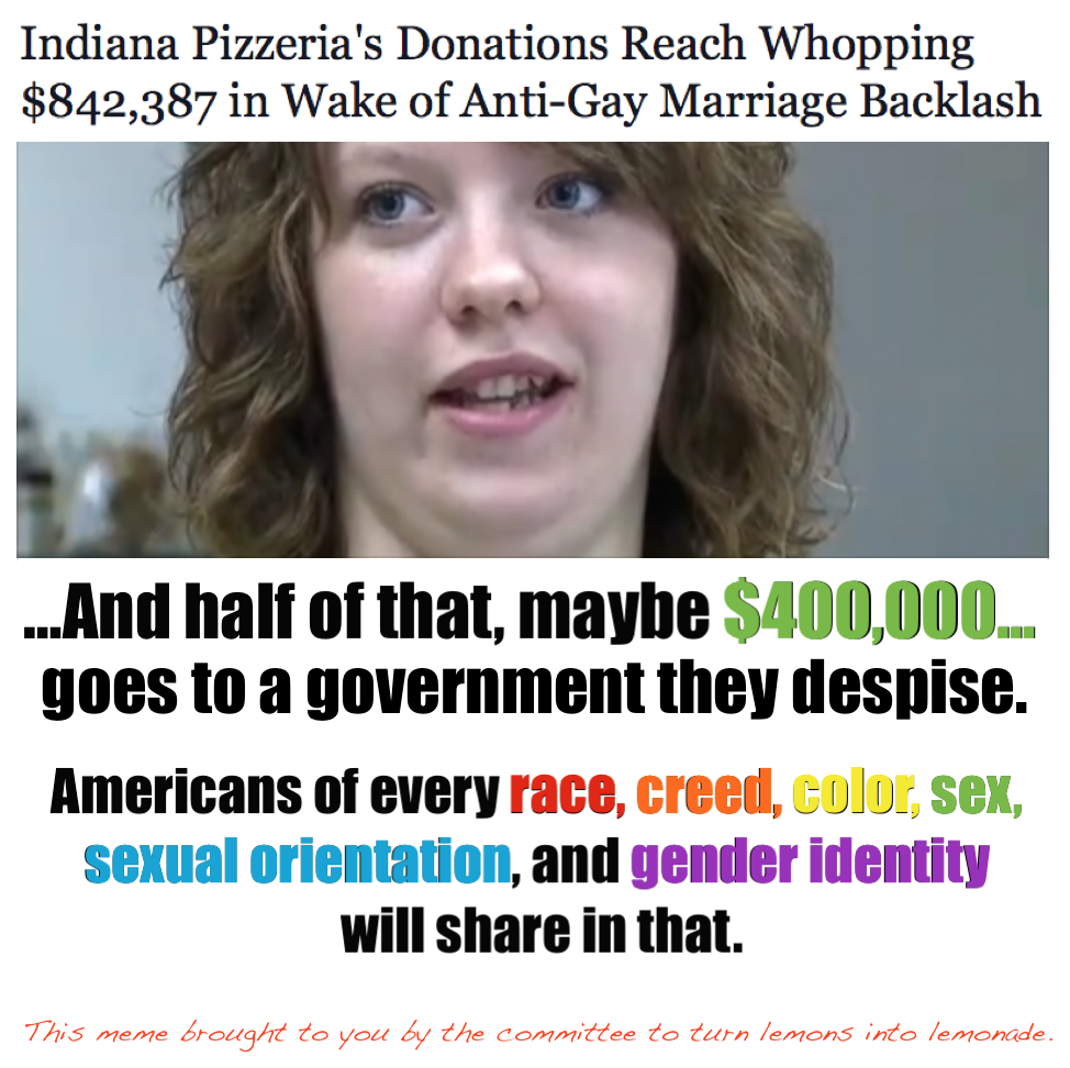 I figure come next April we'll be hearing all over the Liberal Media about how the evil Kenyan Muslim guy in the White House stole half the $800k generous Christians donated to a honest, hard-working small businessman to save him from the Gay Mafia. Because Benghazi, or something.