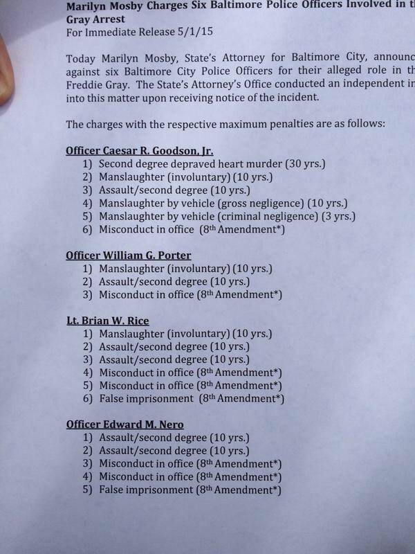 RT @baltimoresun "List of charges against the 6 officers in the Freddie Gray case: " http://ht.ly/Mo3zz