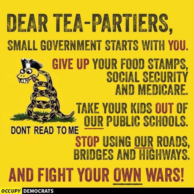 Also, even if they want SS and medicare gone which the vast majority don't, they would still have to receive the portion they paid for and so you can't ask them to stop receiving from a program they've already paid for. But then again. tea partiers do not hate medicare and social security, they maybe asking for other programs to be cut but they absolutely love the programs the graphic selected (check the polls).