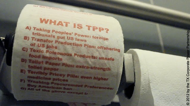 Two dozen rogue "delegates" disrupted the corporate-sponsored welcome gala for the high-stakes Trans-Pacific Partnership (TPP) trade negotiations yesterday with a fake award ceremony and "mic check." Other activists, meanwhile, replaced hundreds of rolls of toilet paper (TP) throughout the conference venue with more informative versions, and projected a message on the venue's facade.